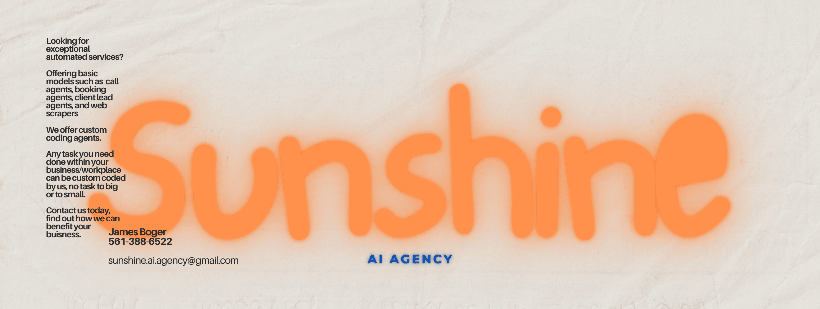 At sunshine, we find a way to fill any need within any niche. We custom code our bots using python script to autonomously fulfill any task, for any business. There is no "specific" business we help because we find a way to bring value to all. We currently work with corporate companies and small businesses, such as medical practices, online stores, realtors, auto & food industries, shipping yards, print/design shops, cyber/technical industries and retail.